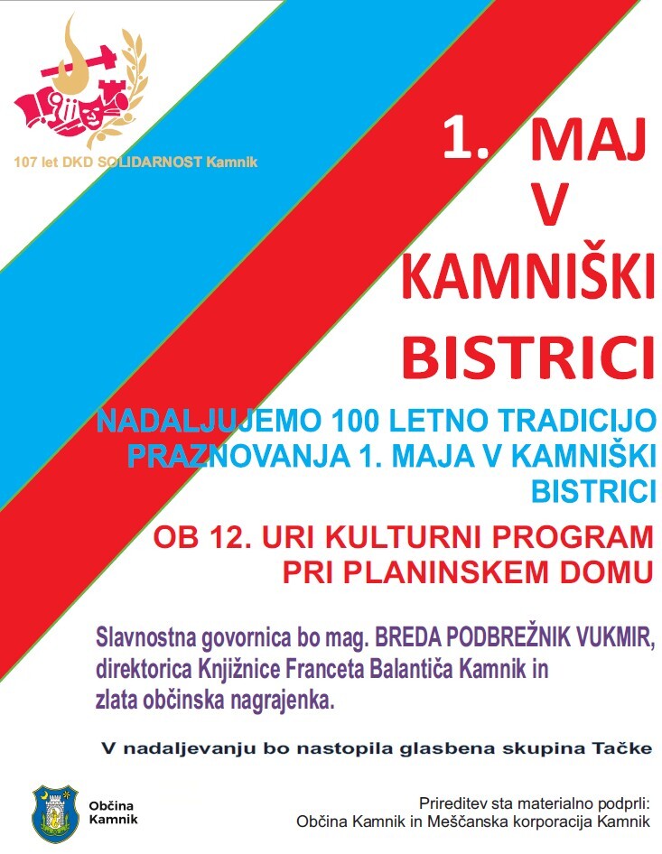 Vabljeni tudi na slovesnost DKD Solidarnost Kamnik ob prazniku dela, ki bo v petek, 1. maja 2026, ob 12. uri pri Planinskem domu v Kamniški Bistrici.